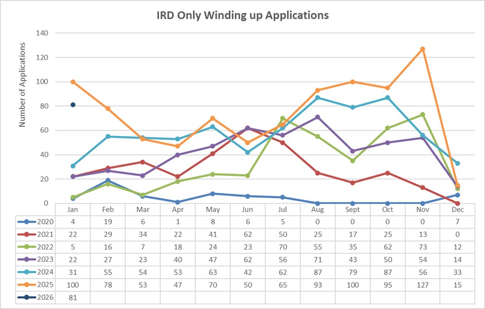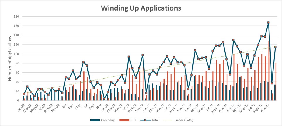 December 2025 was the first time in in 32 months where all other creditors applications amounted to more than those advertised by the IRD. I would be hesitant to read to much into this however due to the Christmas close down period December is traditionally a slower month for IRD winding up applications. If this had happened in any other month it may have been worth more of a mention.