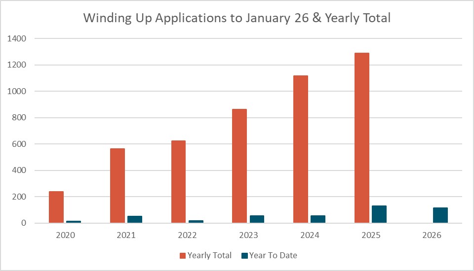 The January monthly total was 115 applications, slightly down on the 2025 total of 130 application. This drop was made up entirely of a reduction in IRD winding up applications from 100 in 2025 to 81 in 2026. Theses application all had February and March hearing dates, so we are expecting to have a busy 2 months to start the year from court appointments.