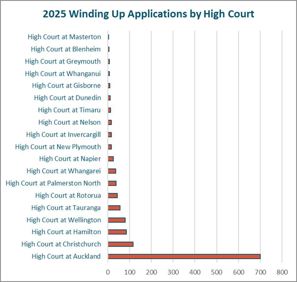 The Auckland High Court dealt with more winding up applications than the rest of the country combined in 2025 700 applications vs 589 applications. That is a fair bit of creditor enforcement and a wide margin between Auckland and the rest of the country,