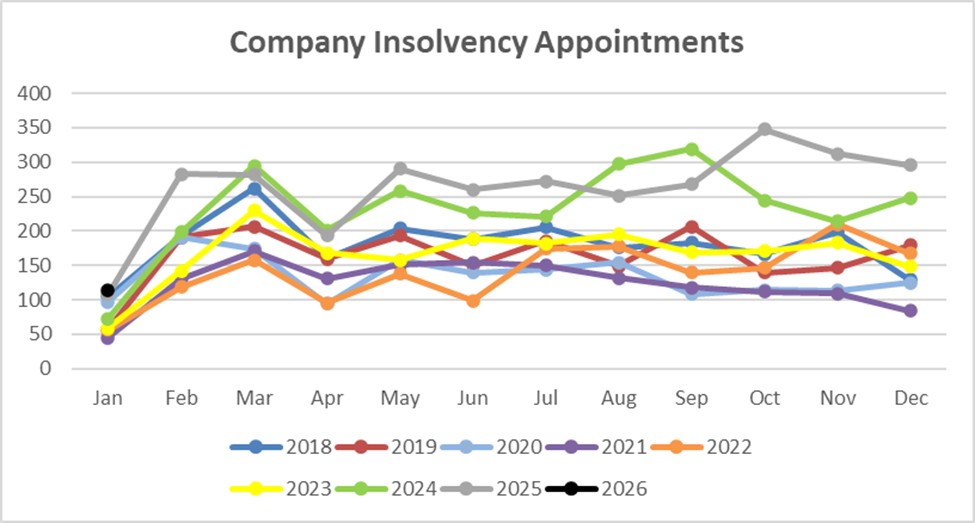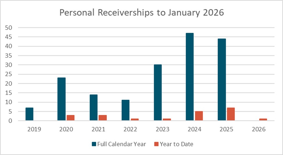 Personal receiverships slowed in the final quarter of 2025 finishing out the year slightly down on 2024. This slowdown has carried through to January 2026 with only 1 new appointment in the month. As corporate insolvencies continue at elevated levels we expect this to pick up over 2026 as companies default the creditors come calling on the stakeholders that have provided security over their personal assets in order to recover something on their debt.