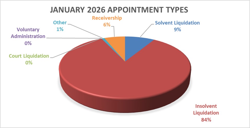 With the high levels of winding up application this month and towards the end of 2025 the number of court appointed liquidations is expected to remain high, however with the courts closed in January shareholder insolvent liquidations made up 84% or 96/114 total for the month with Receiverships and Solvent liquidations filling out the rest. Solvent liquidations continue to remain down on their average but we expect to see them pick up as we head into the end of the financial year.