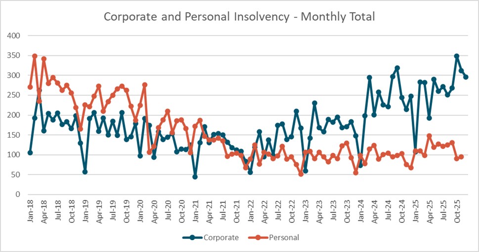 Personal insolvency figures have remained stable at only slightly elevated levels for the 2025 year. When compared to the corporate insolvency levels the two have previously tracked along together while in the last 2 years corporate insolvencies have tracked up while personal insolvency has remained largely flat.