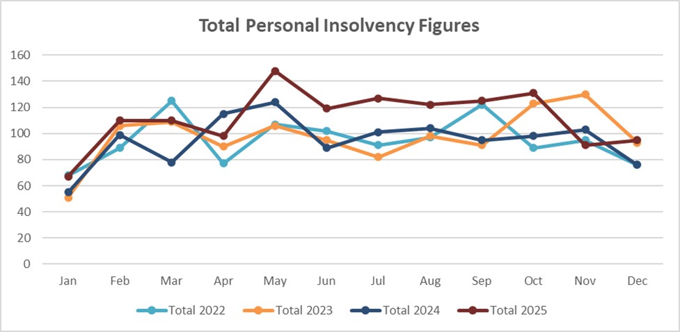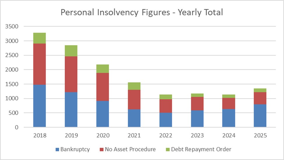 Year on year the 2025 figures were above the last 3 years, while on the increase they remain behind the 2021 figures. This period remains one of the lowest bases for personal insolvency figures.