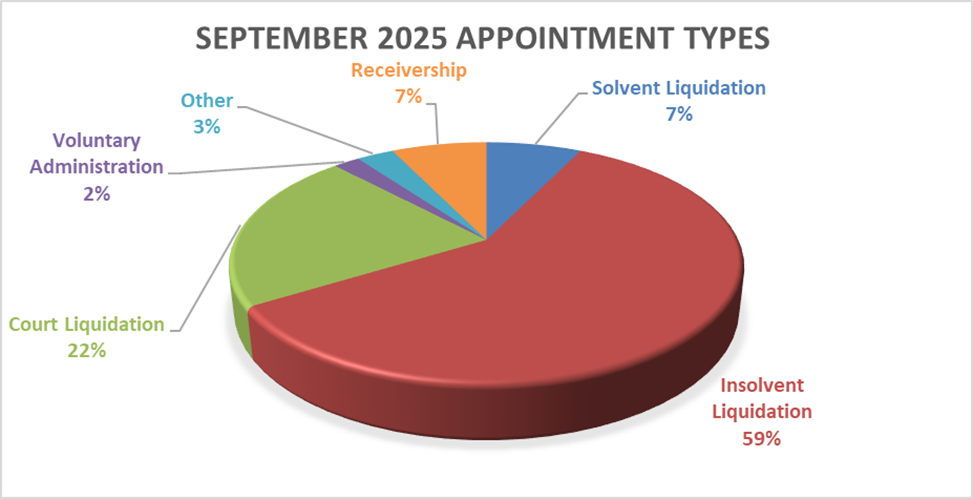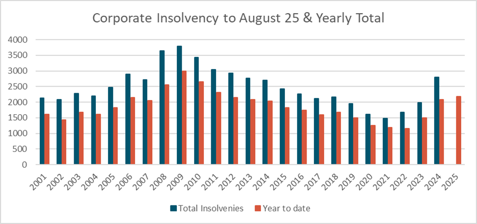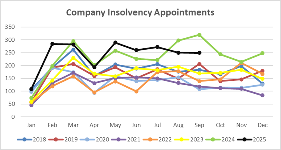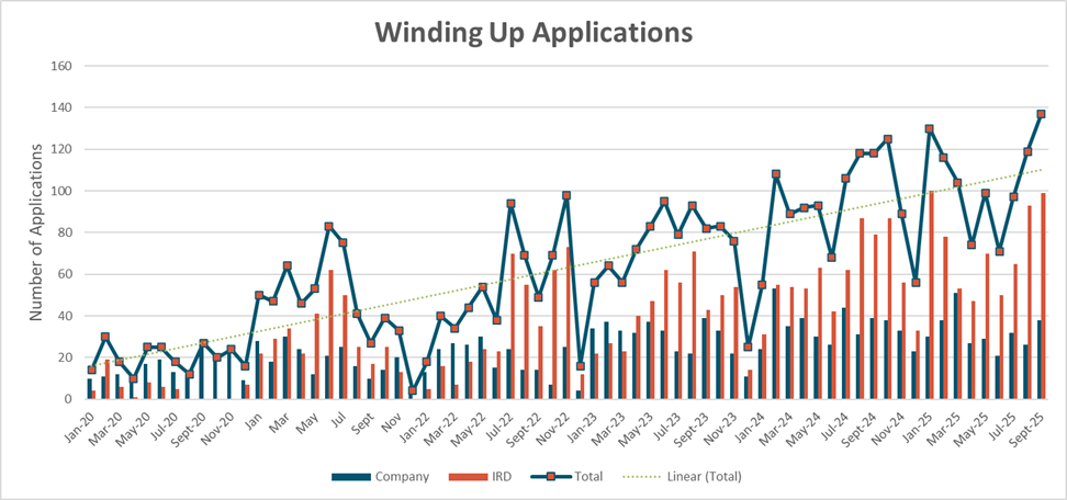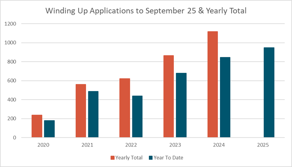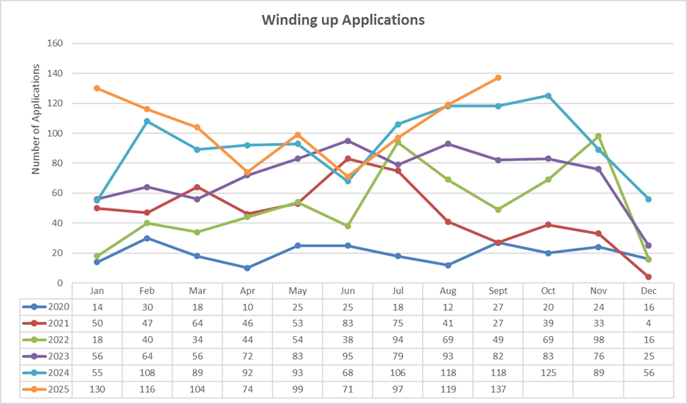 Winding up applications for September 2025 were the highest they have been in the last 5 years hinting as a big end to the year for creditor enforced liquidations and liquidations overall. 2025 continues to easily exceed 2024 in total numbers and looks on track to exceed 1,200 applications.