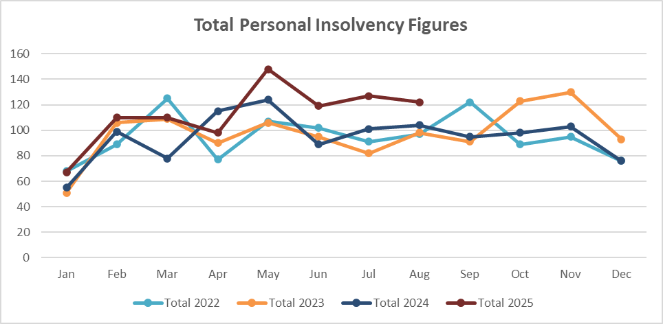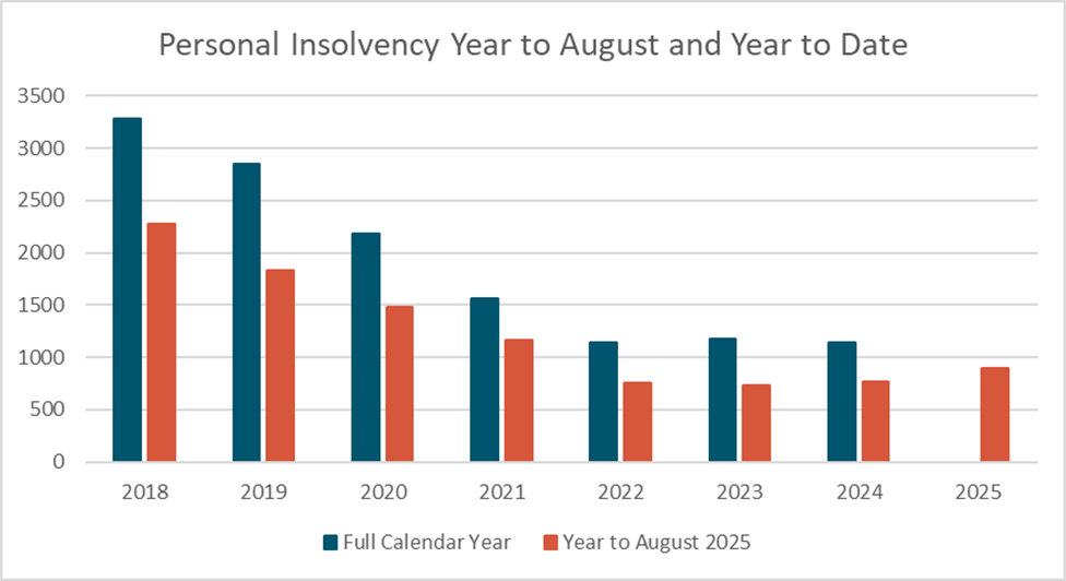 Year on year the 2025 figures are now noticeably above the last 3 years, while on the increase they remain behind the 2021 figures. This period remains one of the lowest bases for personal insolvency figures.