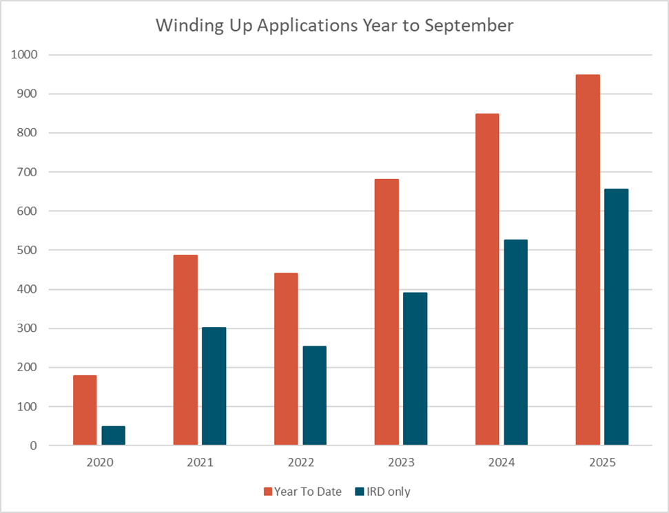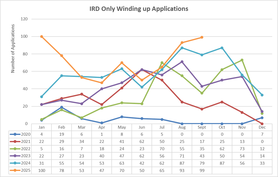 Another month where we see the appointment figures down on the 2024 numbers but they remain above all other years displayed back to 2018. With this months high in winding up applications and the IRD's continued enforcement pressures we are not expecting to see the appointment figures decrease in the short term.