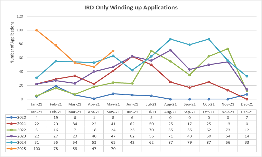 The May winding up figures were above the level of the last 5 years, but still down from the highs experienced at the start of the year when IRD was catching up on its Christmas closure.