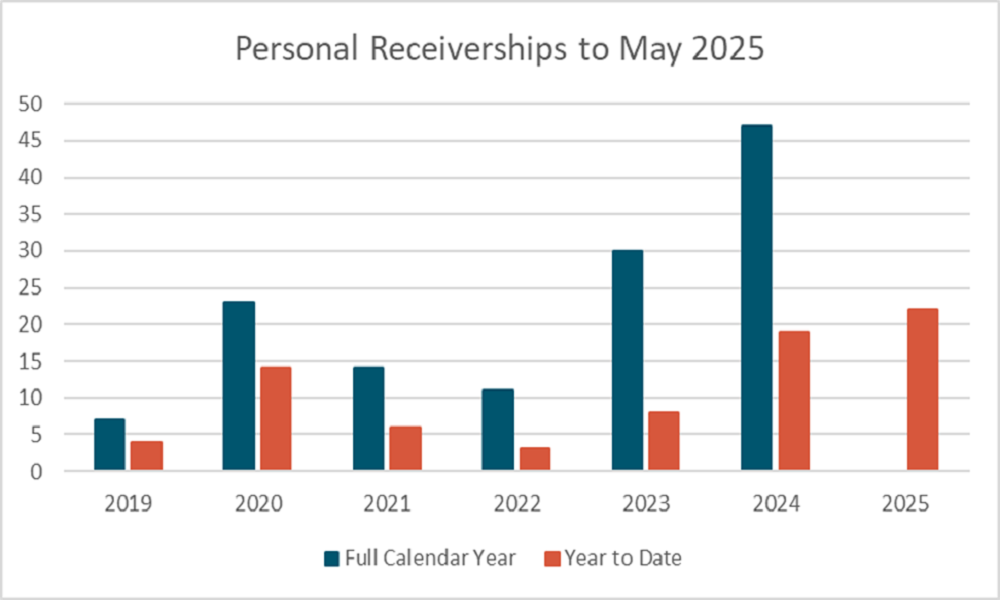 May saw the number of personal receivership appointments continue to steadily rise ahead of the 2024 figures. As more companies continue to default on their lending personal security agreements are being called up, we believe this will continue to track upwards for the remainder of the year. There continue to be a number of tier 2 – tier 4 lenders who made some questionable lending over the least few years and are now having to take enforcement steps to try recover any value on their securities.