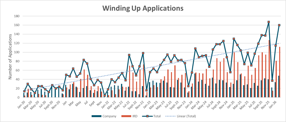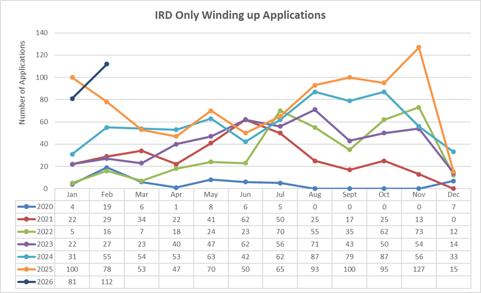 Businesses are still under the pump, and it is being driven by the IRD in large part making up 193 of the 275 January and February winding up applications.